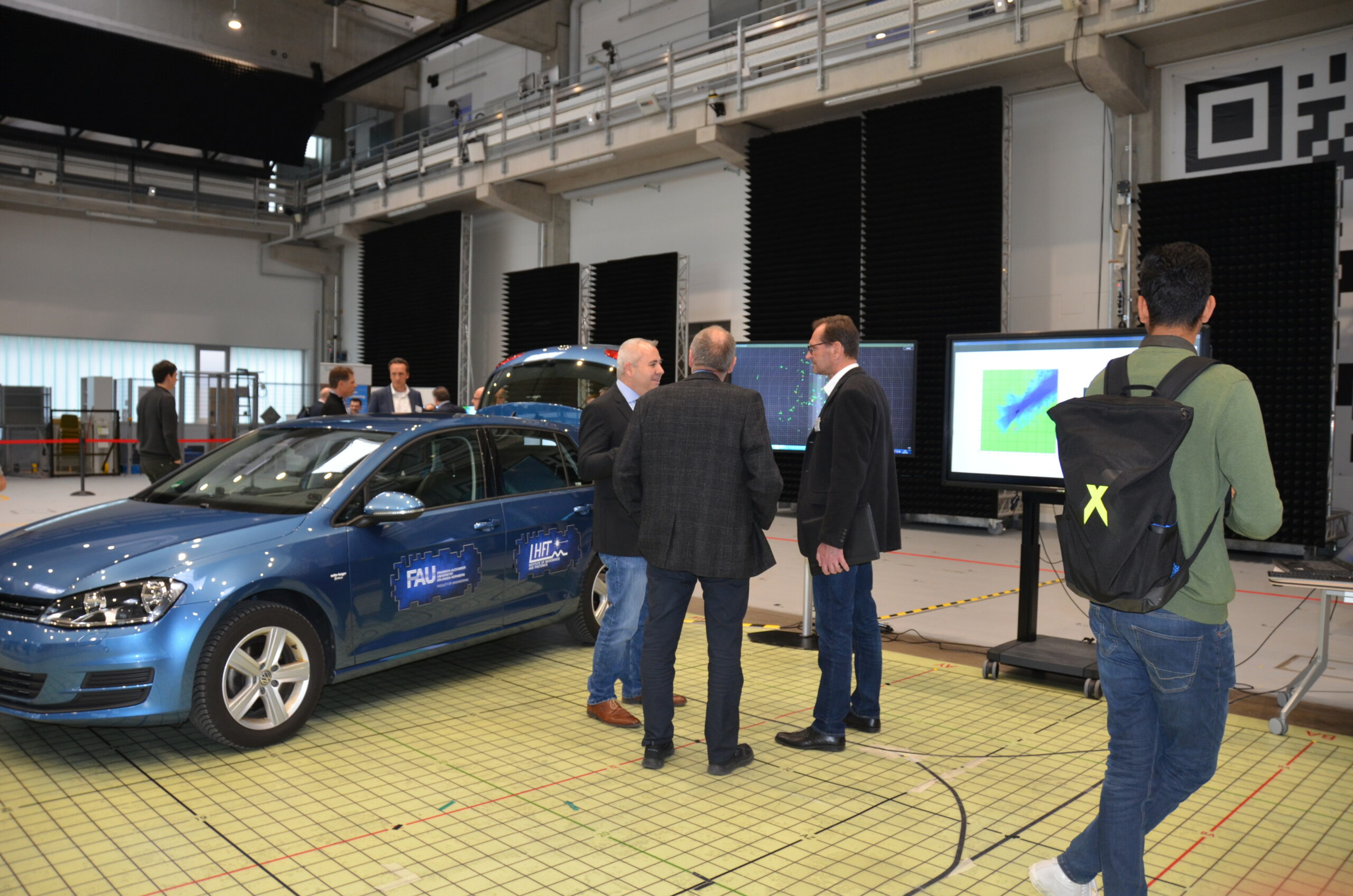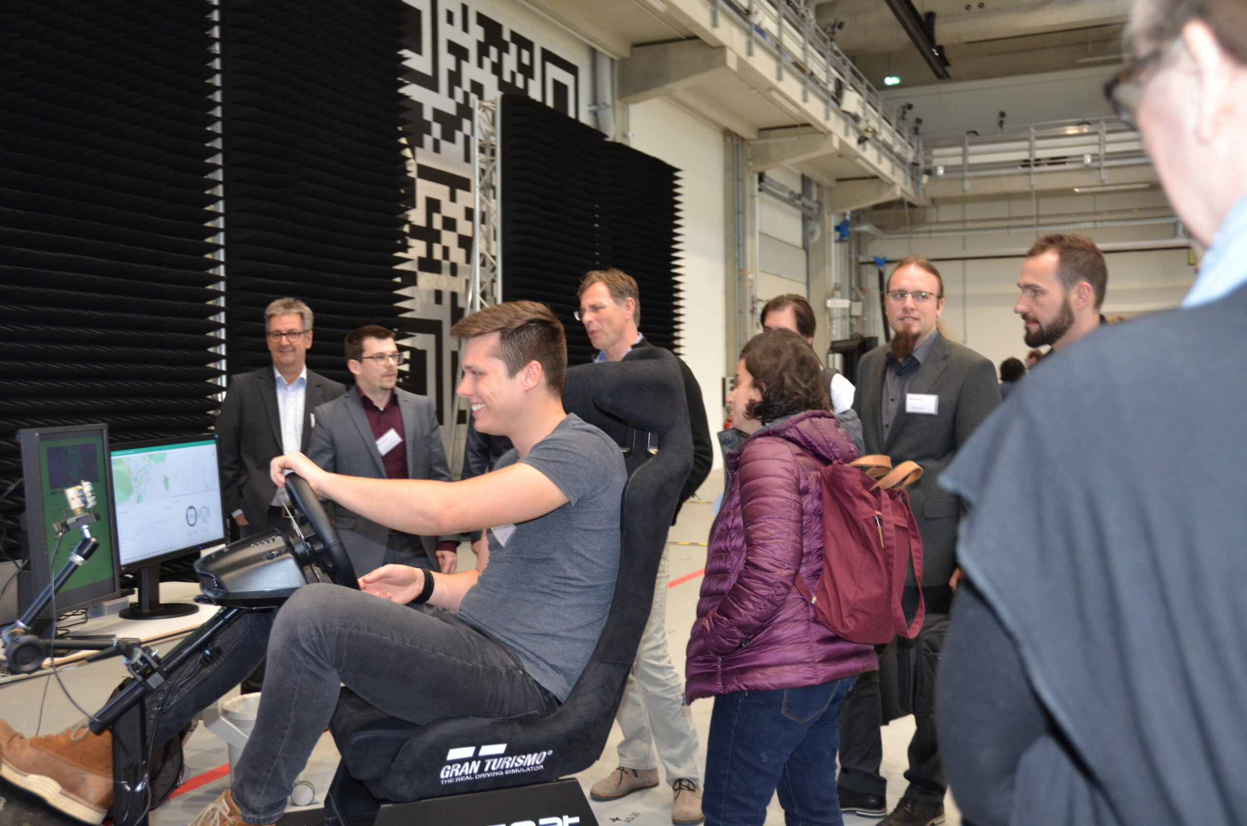 Anschließend gab es ein Gettogether mit Imbiss in der Fraunhofer L.I.N.K.-Halle am Standort Nordostpark 84 in Nürnberg. Insgesamt sechs Demonstratoren innovativer Technologien konnten hier betrachtet, erklärt und zum Teil sogar ausprobiert werden. Ein Themenkomplex waren die Sensorik rund ums Auto, bei dem vor allem die Umfelderfassung mit RADAR an einem Fahrzeug gezeigt wurden sowie die Datenverarbeitung der video- und radarbasierten Algorithmen zur Fußgängererkennung. Auch das Thema „KI im Auto“ wurde demonstriert. Der zweite Themenblock befasste sich mit Simulationswerkzeugen zur Entwicklung von Fahrerassistenz-Systemen: Einerseits ging es um die Auswirkungen der Dimensionierung von Boardnetzwerk und Datenkompression mit großen Sensordatenmengen, andererseits um die Entwicklungsunterstützung für die Erkennung von Fahrerzuständen. Hauptkritik der Besucher bestand in einer zu kurzen Dauer.