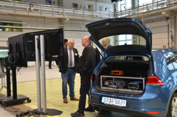Nach der Kaffeepause, die intensiv zum Networking genutzt wurde, präsentierten Dr.-Ing. Jan Schür (FAU, Lehrstuhl für Hochfrequenztechnik) und Dr. Stephan Junger (Fraunhofer IIS) Testmöglichkeiten für Automobilsensorik wie RADAR, LIDAR und weiteres vor, die im Rahmen des ESI-Anwendungszentrums angeboten werden können.
