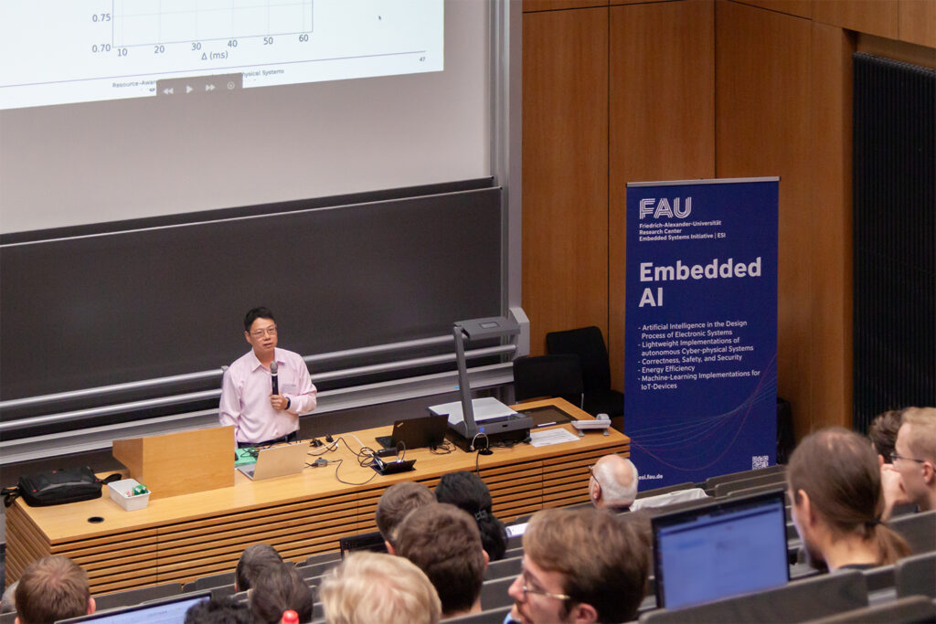 Am Freitag, den 10.10.2025 fand an der Friedrich-Alexander-Universität Erlangen-Nürnberg unser 19. Embedded Talk zum Thema „Deep Learning an Narrow Resources“ statt. Die Veranstaltung, die von etwa 60 Teilnehmenden besucht wurde, bot eine Plattform für Expertinnen und Experten und Forschende aus der Branche, um über aktuelle Entwicklungen und Herausforderungen im Bereich der maschinellen Lernverfahren für Systeme mit beschränkten Ressourcen zu diskutieren. Die Veranstaltung begann mit einem Willkommenswort von Prof. Dr.-Ing. Jürgen Teich, Sprecher des FAU Research Center ESI. Anschließend hielt Prof. Dr. Jian-Jia Chen, TU Dortmund / Lamarr-Institut für Maschinelles Lernen und Künstliche Intelligenz, eine Keynote-Vorlesung zum Thema „Resource-Aware Machine Learning for Cyber-Physical Systems“. In seiner Präsentation beleuchtete er die Herausforderungen und Möglichkeiten von maschinellen Lernverfahren in Cyber-Physical-Systemen. Im Anschluss präsentierte Mark Deutel, Researcher am Fraunhofer IIS und FAU Erlangen-Nürnberg, seine Forschungsergebnisse zum Thema „On-Device Training of Deep Neural Networks on Cortex-M Microcontrollers“. Er zeigte auf, wie tiefe Neuronale Netze auf Cortex-M-Mikrocontrollern trainiert werden können.