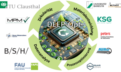 In the DEEP-Opt joint project, funded by the German Federal Ministry for the Environment, Nature Conservation and Nuclear Safety, partners from science and industry are conducting joint research into the sustainable electronics production of the future. The consortium consists of the research institutes Chair of Manufacturing Automation and Production Systems (FAPS) at Friedrich-Alexander-Universität Erlangen-Nürnberg, the Chair of Polymeric Materials at the University of Bayreuth, Neue Materialien Bayreuth, the Institute of Organic Chemistry at Clausthal University of Technology and the industrial companies SEHO Systems, Peters Research, MTM Ruhrzinn, KSG, BSH Hausgeräte and MPM Environment Intelligence. The joint project is supported by the associated partners Isola, Airbus and Bosch.